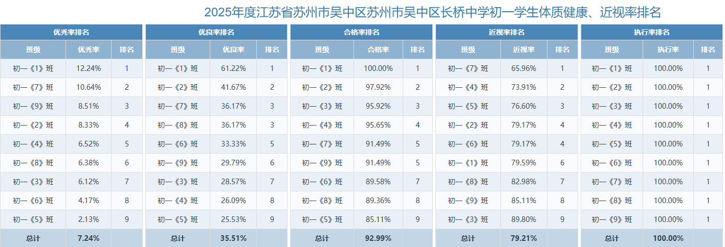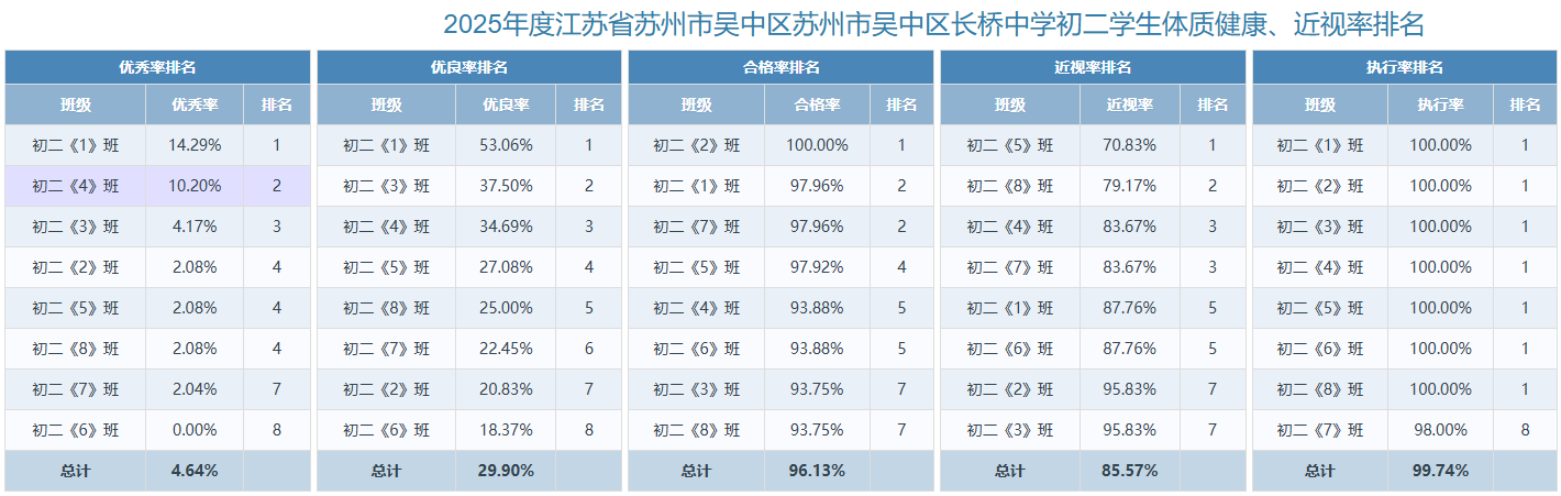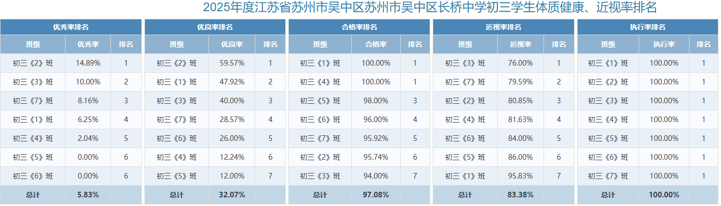 2025年度苏州市吴中区长桥中学学生体质健康、近视率排名